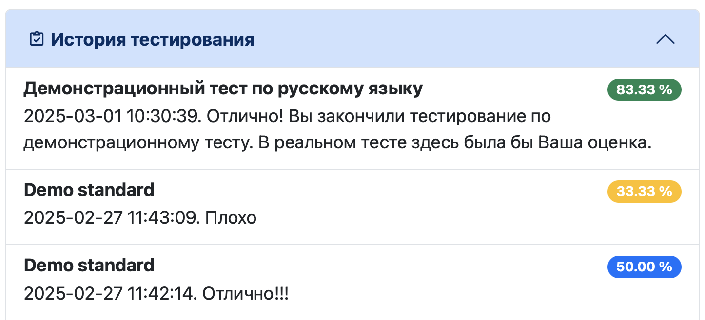 - История тестирования. Несколько последних результатов тестирования. В каждом будет показано название теста, результат тестирования и процент правильных ответов. При этом цвет процента зависит от его значения: от 0 до 24 один цвет, от 25 до 49 второй, от 50 до 74 третий и от 75 до 100 четвертый. Конкретный цвет зависит от визуальной темы интерфейса.